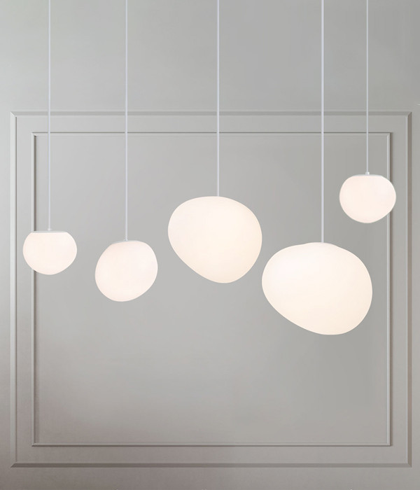 깔끔한 화이트 컬러의 크기가 다른 조약돌 펜던트등을 매치해 공간에 포인트르 주었어요!